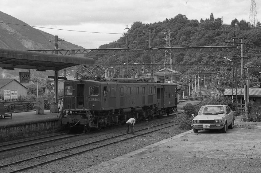 右側の乗用車は初代ホンダアコード。1977年、身延線の芝川駅にて撮影。 | ||