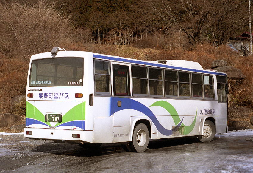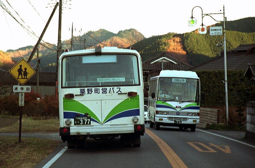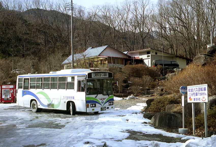 上2枚 口粟野車庫−山の神線 バス折り返し場で待機する、粟野町営バス