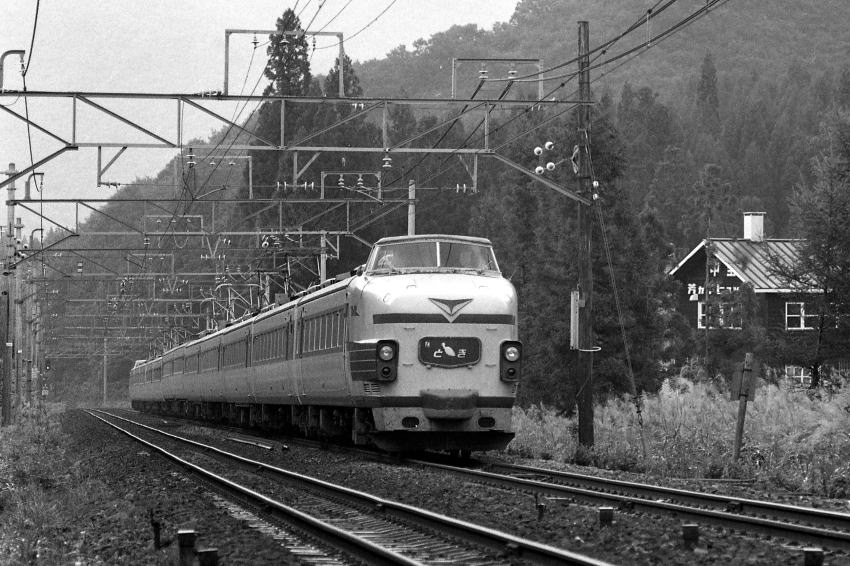 | 越後中里のバンガローを横目に上野を目指す、「とき」号。1980年、上越線にて撮影。 | ||