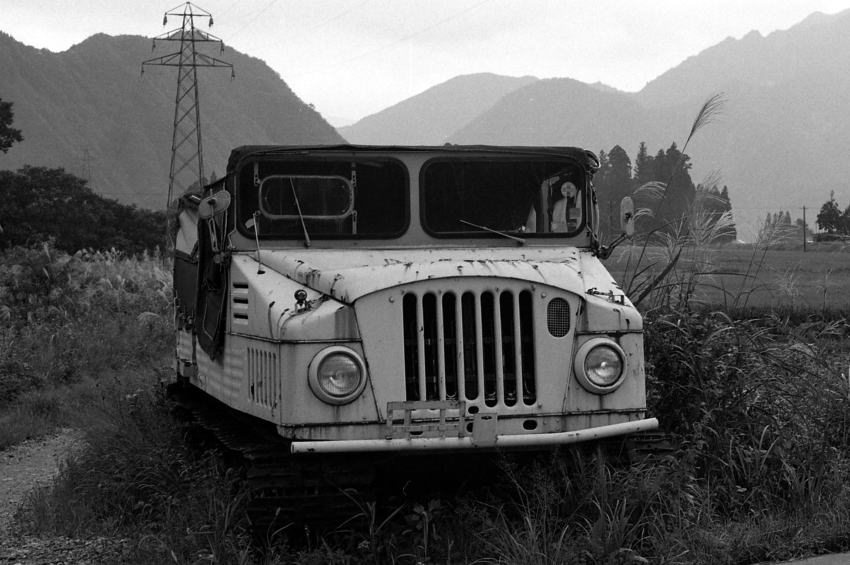 | 越後中里駅付近の農道脇に捨てられていた、自衛隊払い下げ(?)の雪上車。1980年撮影。 | ||